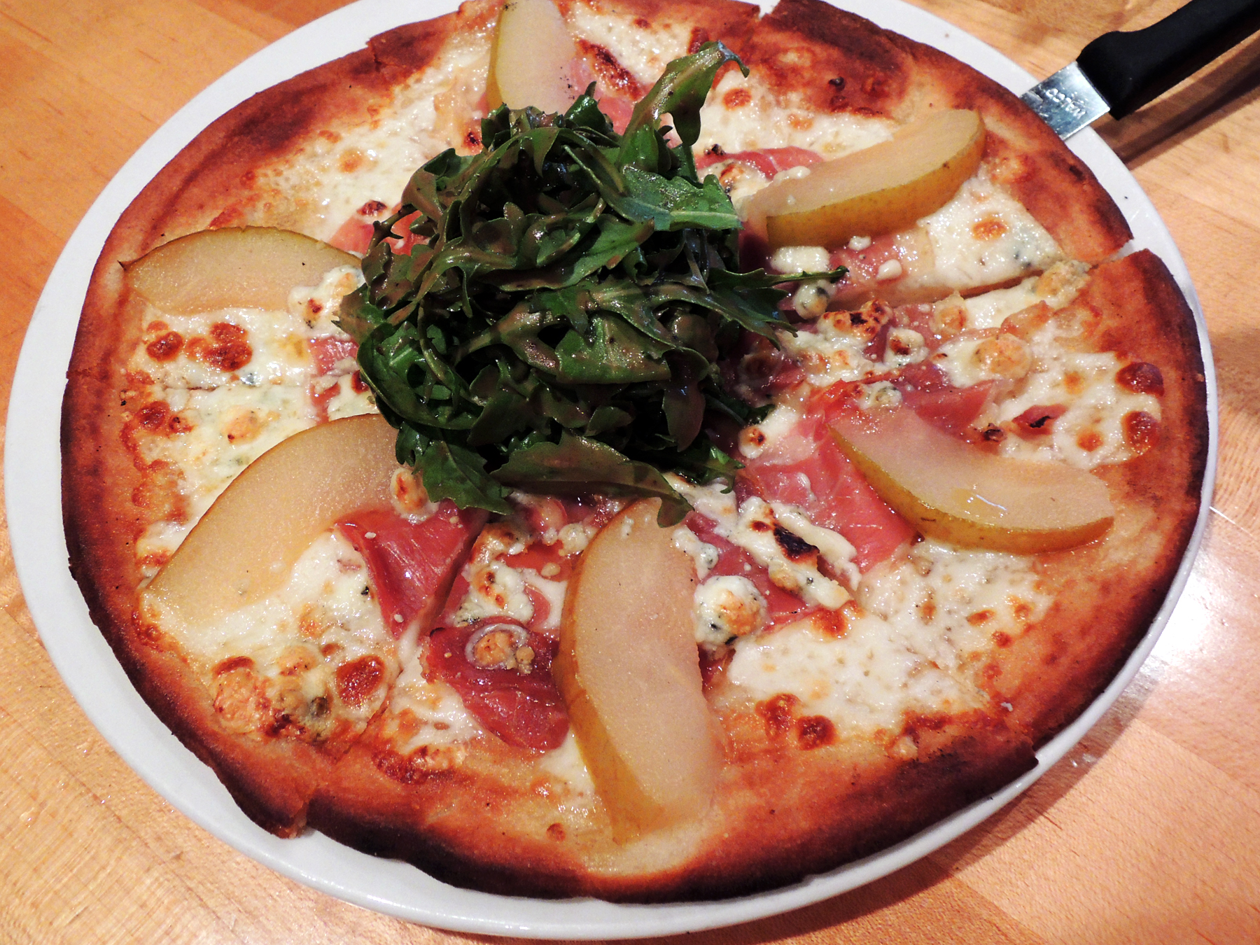 Gluten-free pear and arugula pizza at Sammy’s Woodfired Pizza