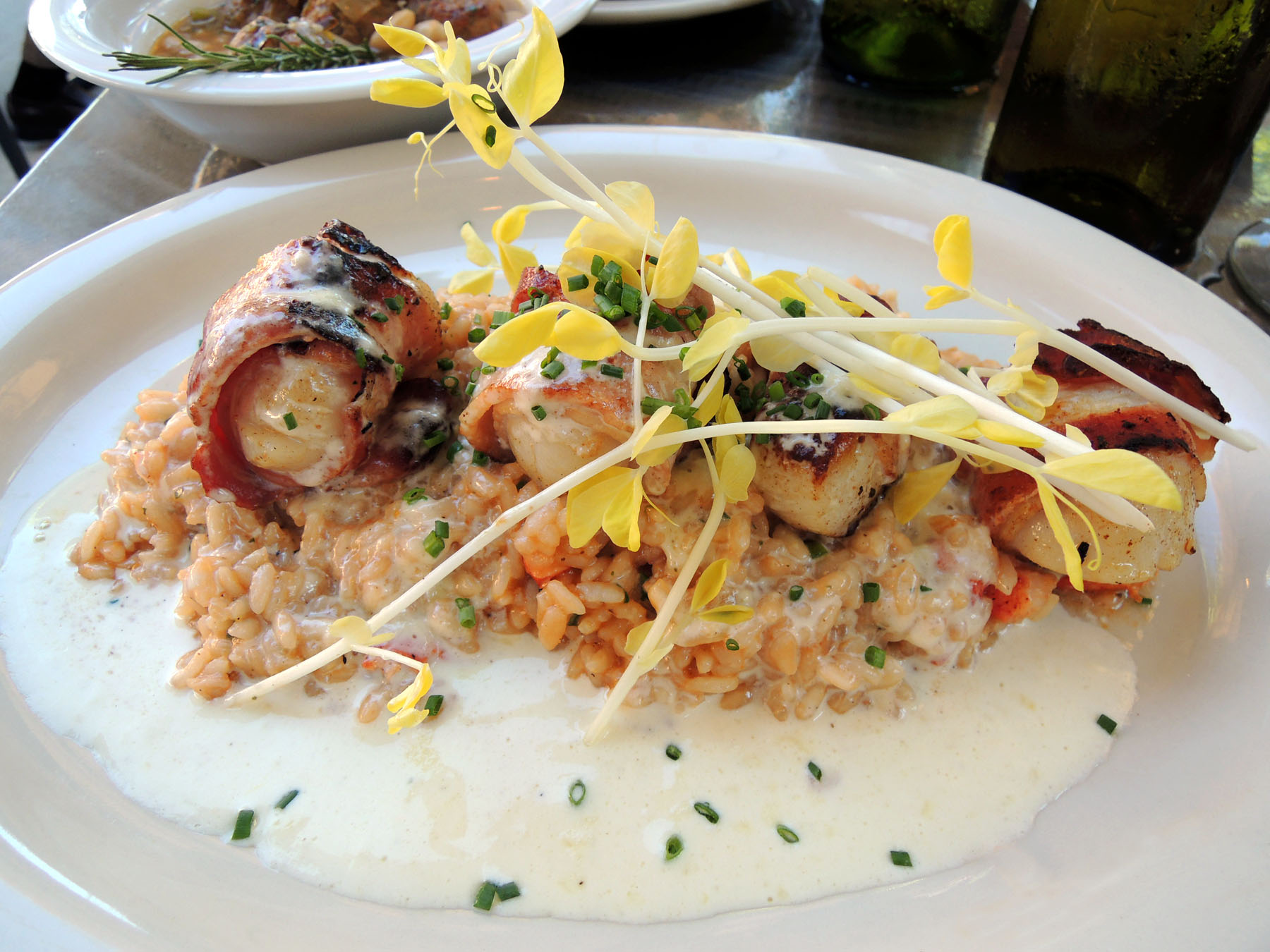 Bacon wrapped scallops with a lobster risotto Bacon wrapped scallops with a lobster risotto at Fig Tree Cafe Liberty Station